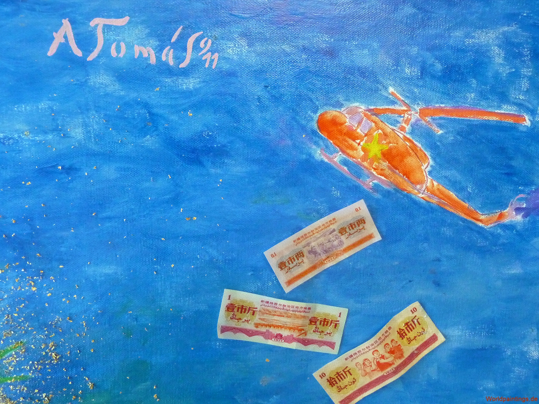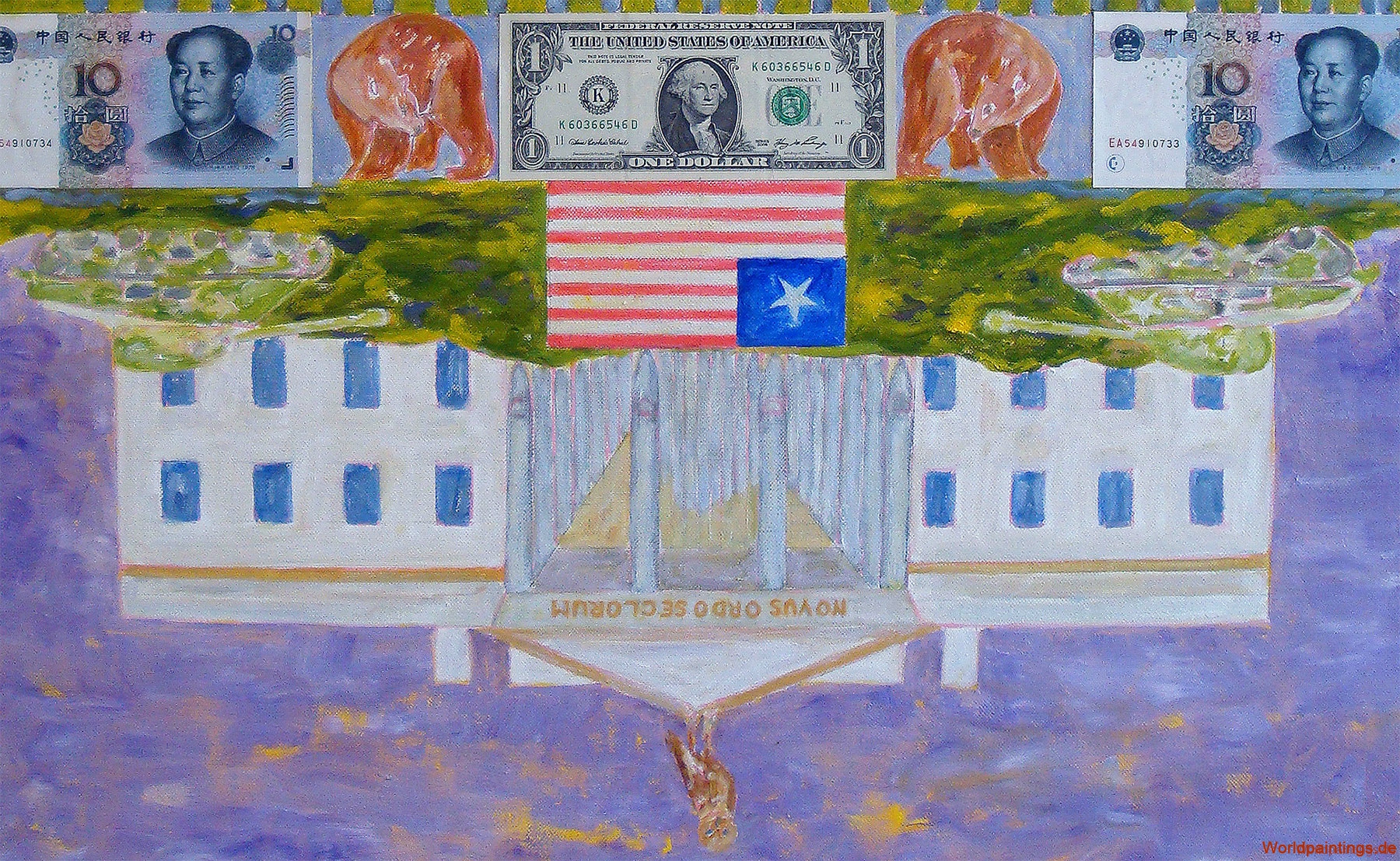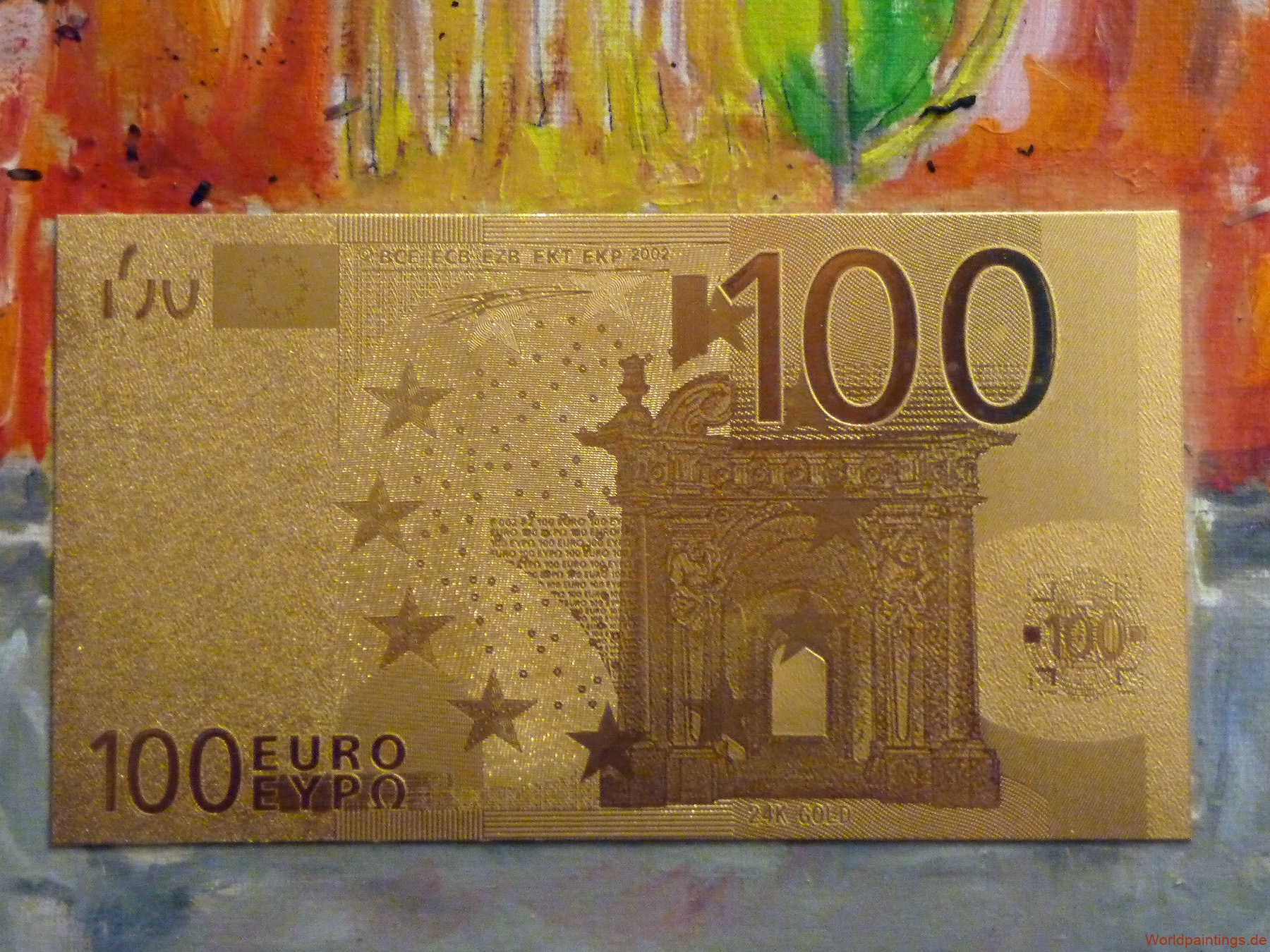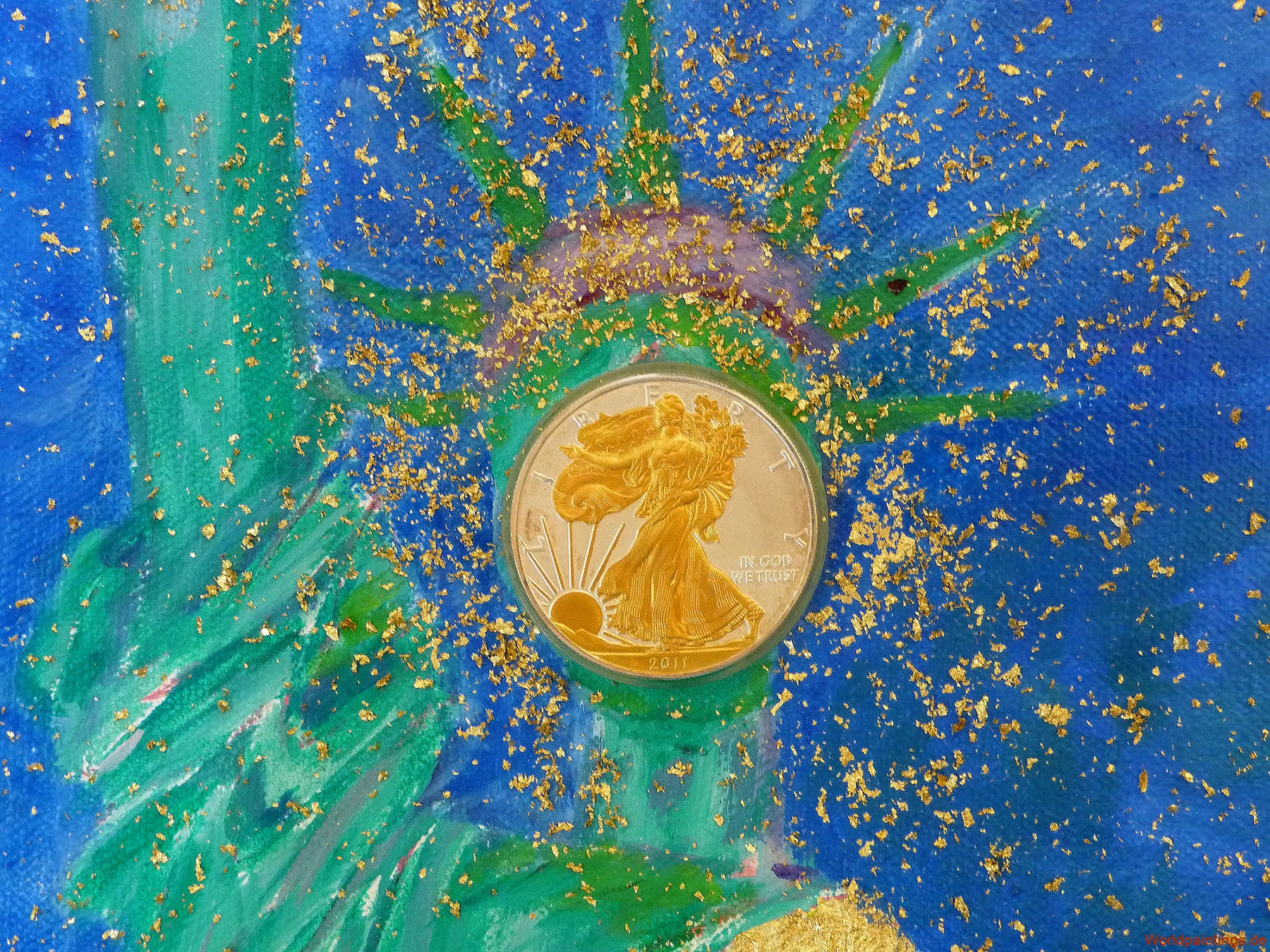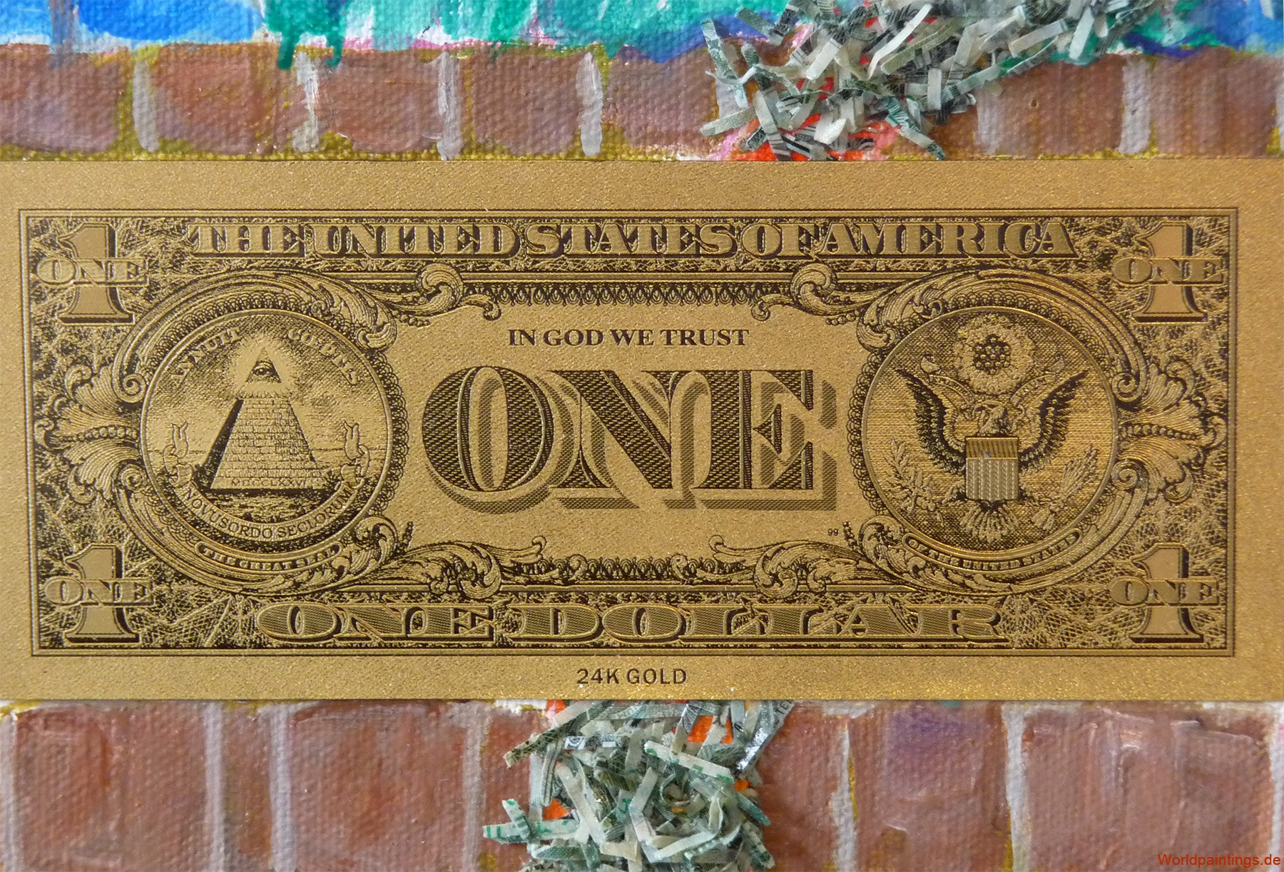 Öl, geschredderte Dollarscheine und vergoldete 1 US-Dollar auf Leinen, H 90 x B 65 – 2.000,- EUR